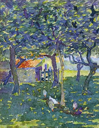 POULES PICORANT AU VERGER, 1915 - Aquarelle, 20 x 15 cm - Cat. # 7