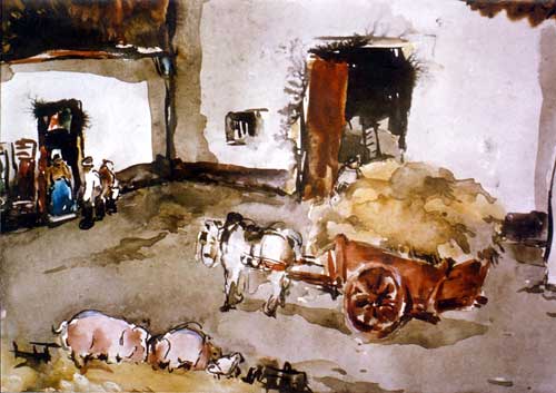 COUR DE FERME AVEC CHARIOT, 1952 - Aquarelle, 18 x 27 cm - Cat. # 880