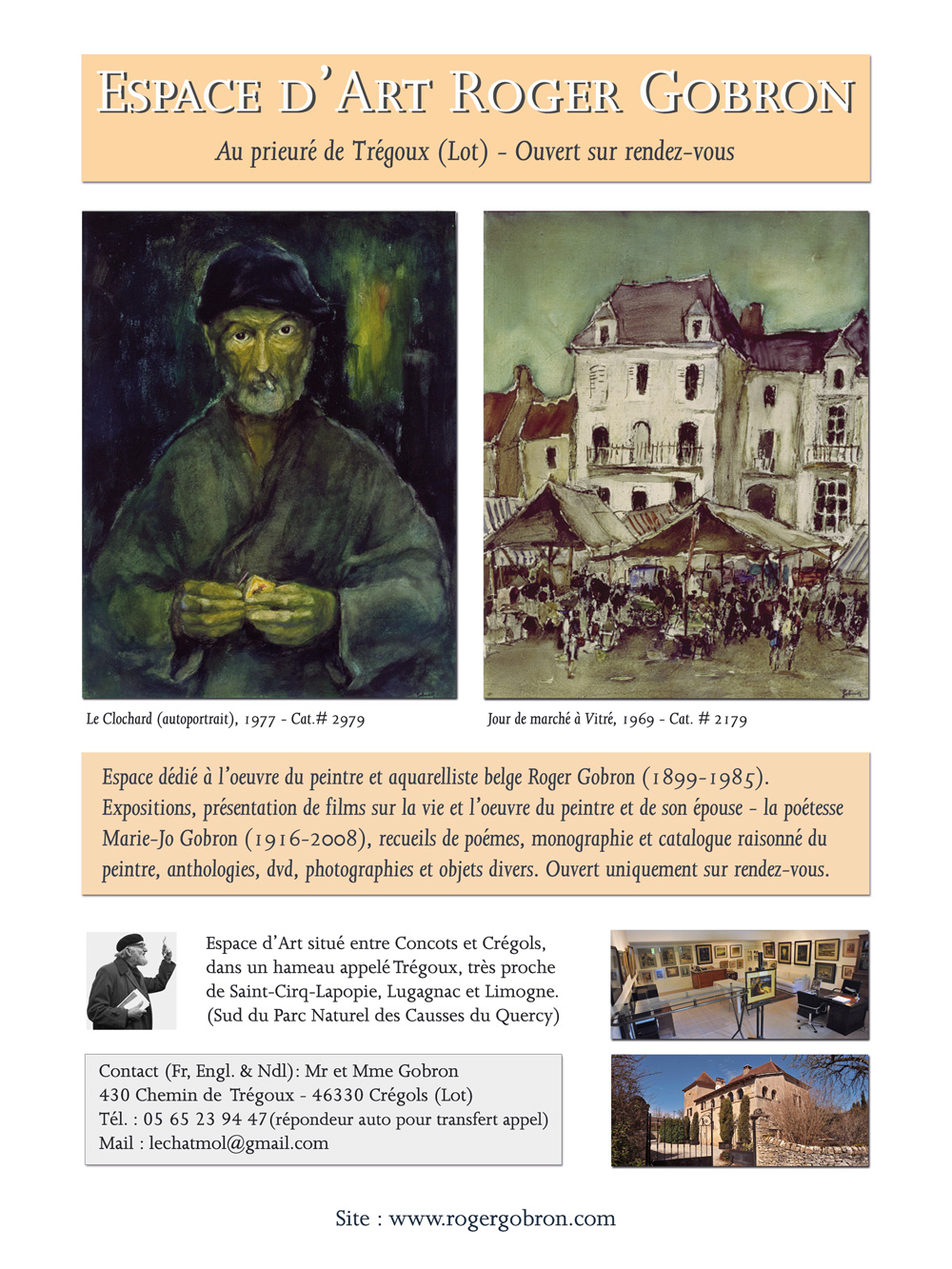 Accueil: dans la colonne gauche de cette page, vous trouverez les dernières actualités concernant les expositions, publications et autres activités relatives au peintre. Biographie: ce lien vous mènera vers une biographie illustrée du peintre. Vous y trouverez égelement un lien vers quelques unes de ses signatures. Galerie: contient une sélection chronologique des oeuvres du peintre. Monographie: vous informera de l'ouvrage, contenant le catalogue raisonné, de plus de 3200 oeuvres, que Roger Gobron réalisa durant sa vie. Film/DVD: vous informera du film documentaire, réalisé, en 16 mm, par le fils du peintre. Le film est également disponible en DVD. Téléchargements: ce ce lien vous permettra de télécharger divers documents utiles, tels que des photographies du peintre, des illustrations de ses oeuvres, des biographies, des articles de presse, etc. Liens: vous y trouverez des liens vers des sites, tels que celui dédié à l'oeuvre de sa femme Marie-Jo Gobron, poète et romancière, et celui de Alcyon Film, ayant produit le film et publié la monographie du peintre, ainsi que vers d'autres sites liés au monde de l'art. Contact: amateurs, collectionneurs, conservateurs et journalistes, à la recherche de plus amples informations, trouveront ici le moyen le plus simple de nous contacter. Langue: retourne à la toute première page de ce site, permettant le choix de votre langue préférée.