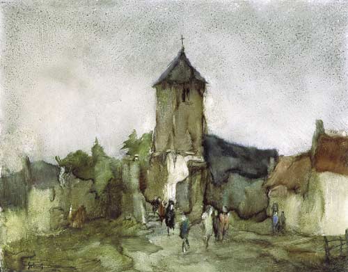 SORTIE DE MESSE EN GAUME, 1983 - Aquarelle, 36,5 x 46 cm - Cat. # 3312